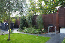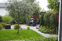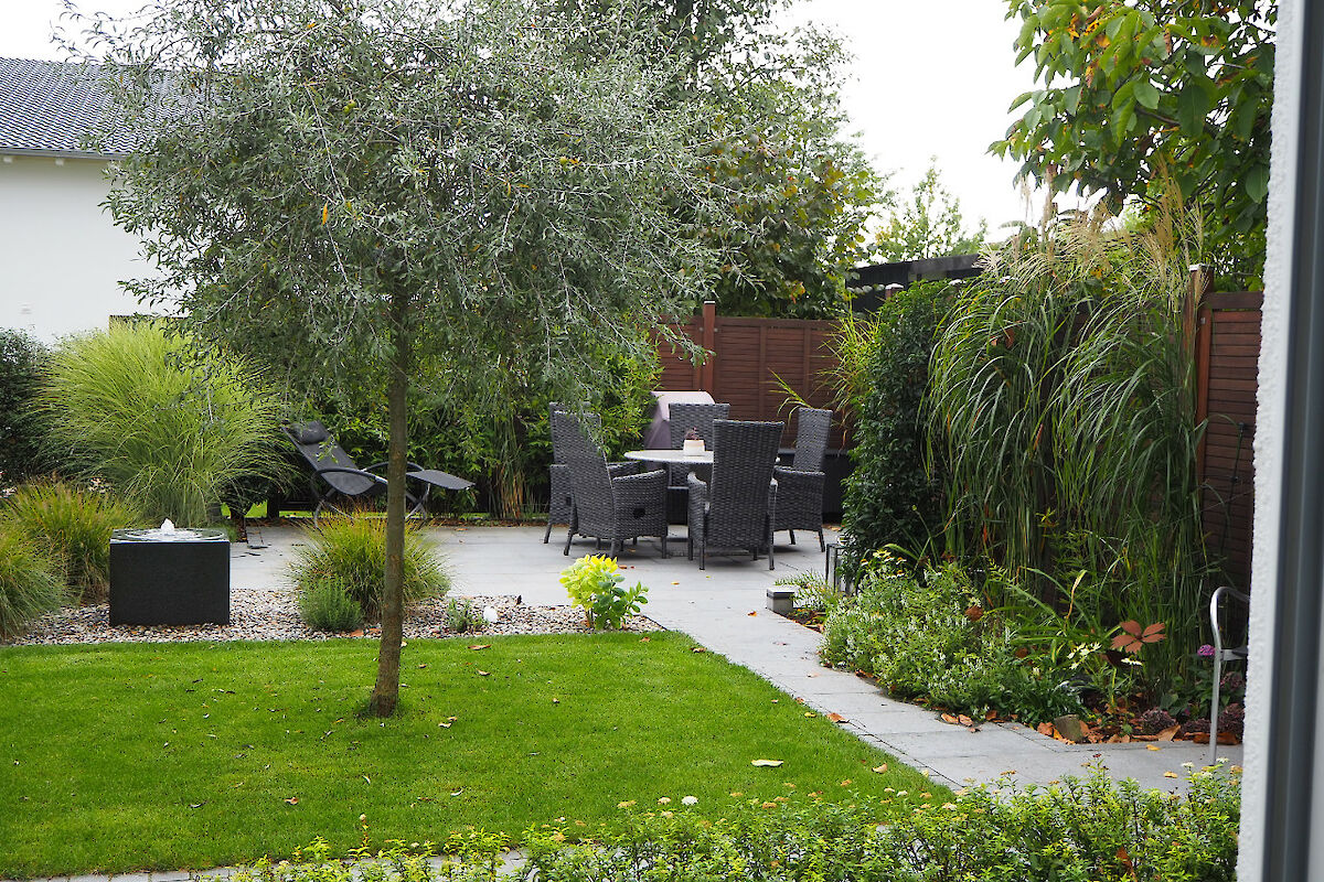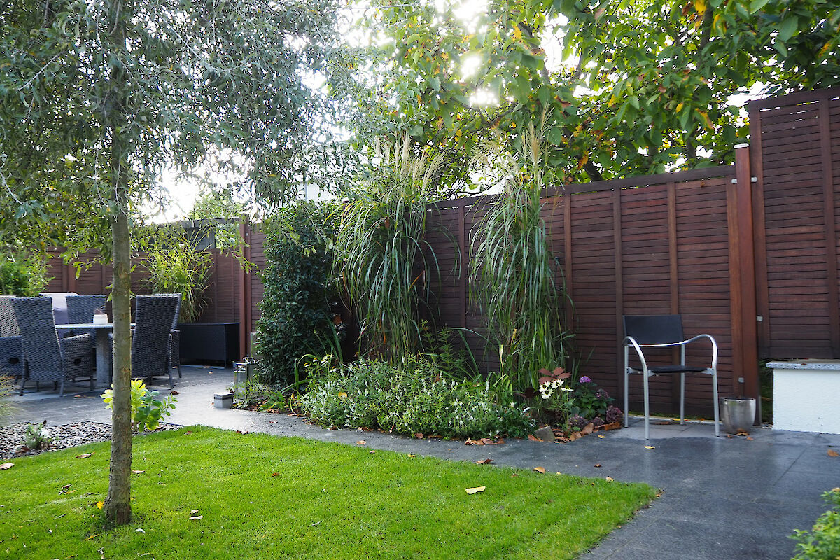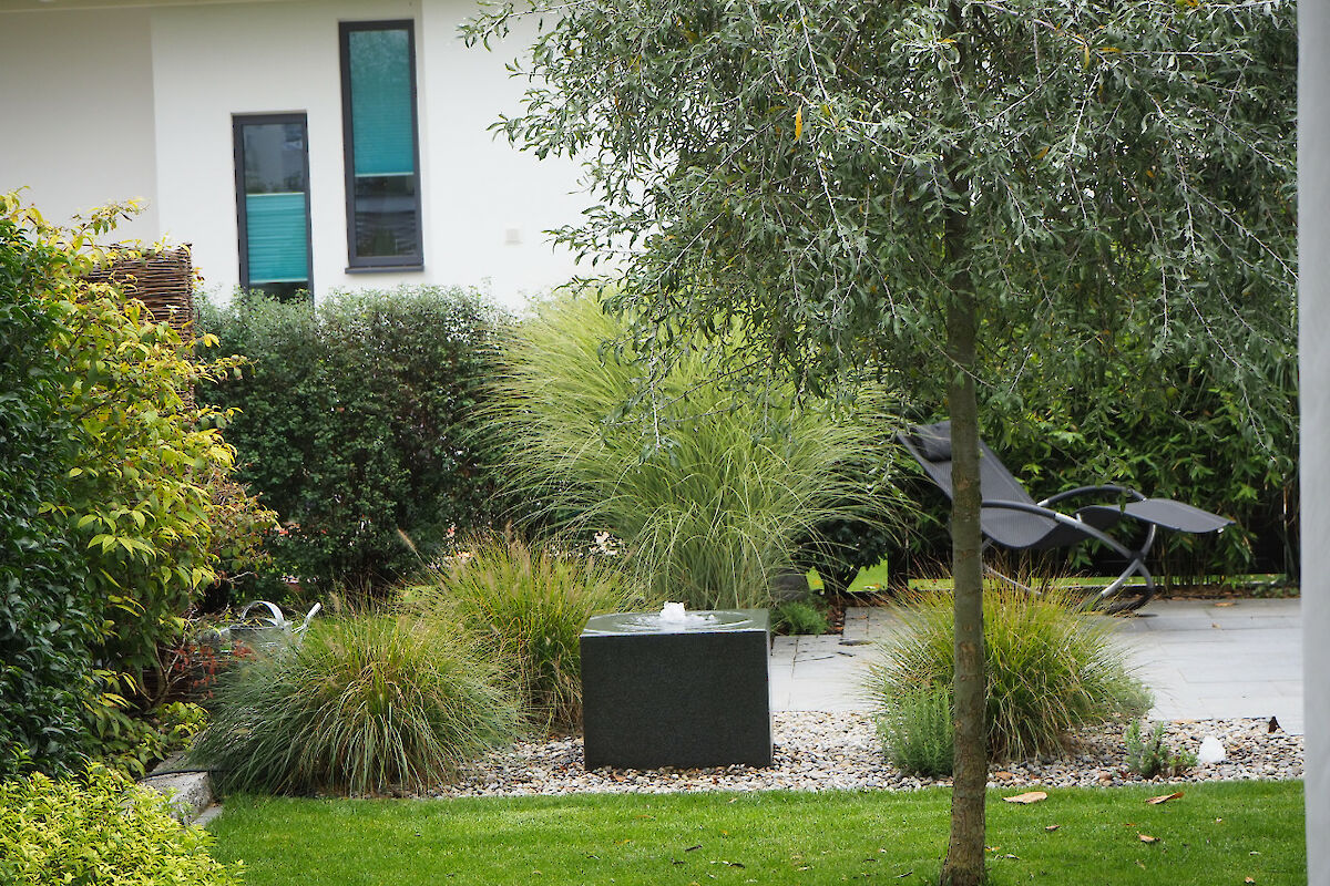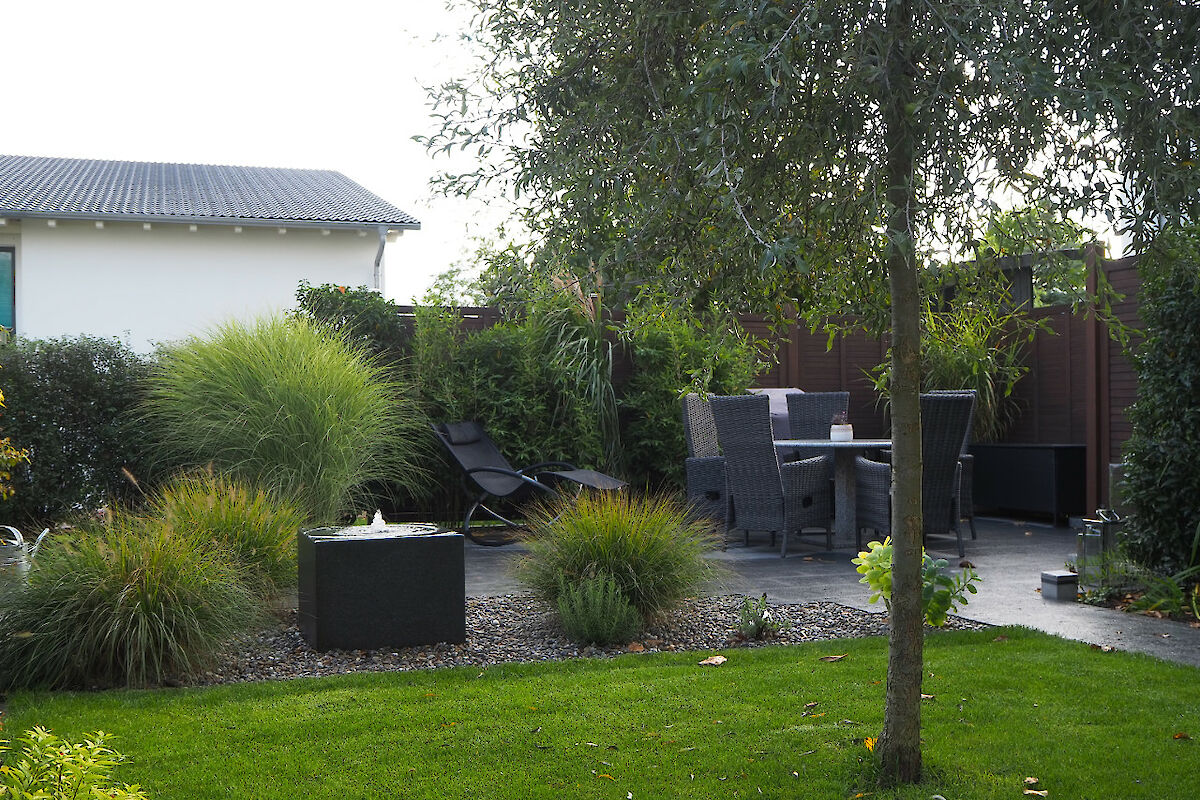 Ein kleiner und feiner Gartenbereich wurde hier zum privaten Wohnraum umgestaltet. Die schlichte Bepflanzung mit kleinem Baum und Gräsern schafft hier Vorder- und Hintergrund für den Blick aus dem Haus und grünt Teile des Sichtschutzes ein.